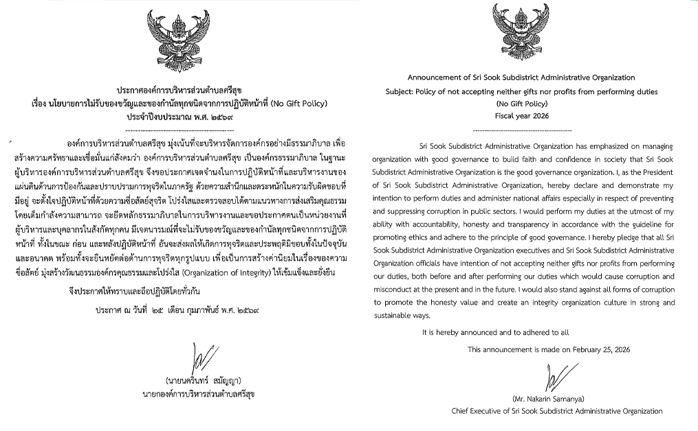 ประกาศองค์การบริหารส่วนตำบลศรีสุข เรื่อง มาตรการเผยแพร่ข้อมูลต่อสาธ...